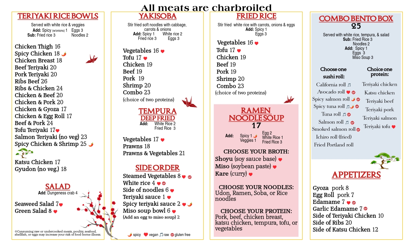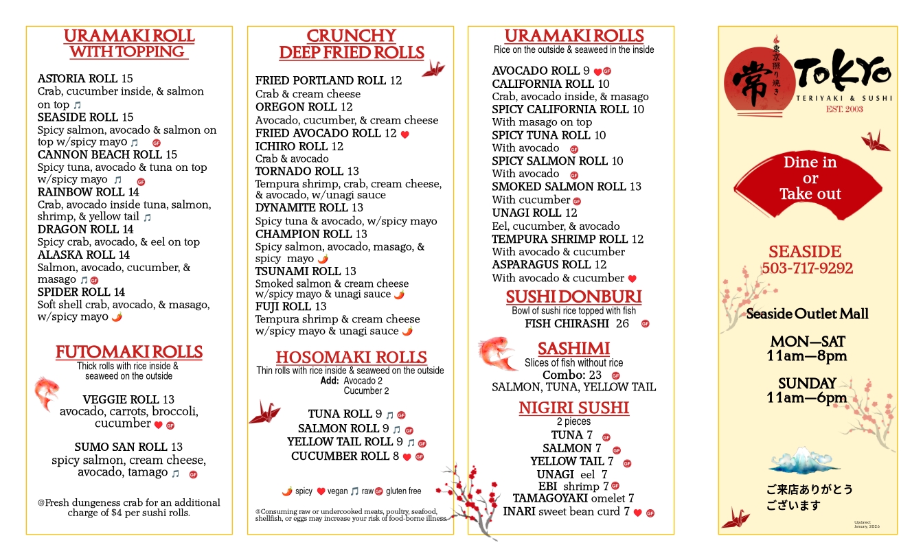 Full Menu Menu: Click on the following images to make it bigger: Tokyo Teriyaki’s menu (sushi) Tokyo Teriyaki’s menu (Teriyaki). It includes, Donburi, Yakisoba, Tempura, Ramen, Bento